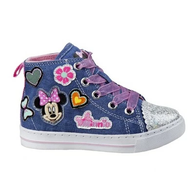 Disney Girl Minnie Mouse Denim High Top Sneakers. Decorative images of Minie Mouse adorn these sparkly high top fashion sneakers for toddlers and young Girls. These tough little kicks will last through months of running and jumping; Suitable for tennis, dance, and gym. Classic sneaker shape with soft padded tongue and collar fits great while looking beautiful for casual or dressy occasions little Girls will love putting their shoes on every day.Great for playing outside and other casual events.Comfortable and easy to put on your kid will love putting their shoes on.Hook and loop closure is a breeze to put on! High-Quality Minie Mouse footwear makes a great birthday or holiday gift.Simply spot clean; Please Reference the Variations for All Available Sizes & Colors!