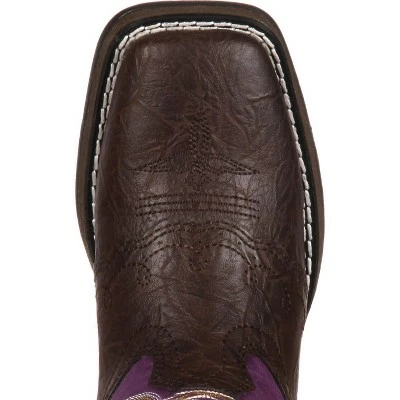 For the girliest little girls, these Lil’ DurangoĀ® Western Boots (#BT386) are perfect! The exterior is beautiful, the interior is comfortable and they have a low heel that any little girl will be able to walk on.These Lil’ DurangoĀ® square toe boots have a leather-like upper; while the material looks great, it is far more durable than traditional leathers and can be cleaned easily. Most little girls love a bright color; the purple hue on the shaft gives them a pop of color that they’ll adore, while the dark brown shade on the foot allows this Western boot to coordinate with numerous outfits. Kids don’t want to wear footwear that isn’t comfy. Between the mesh lining and the Cushion Flex insole, this Lil’ DurangoĀ® Western boot provides plenty of comfort for your child’s feet. The double row welt stitching adds durability, while the 1″ Cowboy heel makes it easy for little ones to walk in these DurangoĀ® Boots.Get your little girl a pair today.