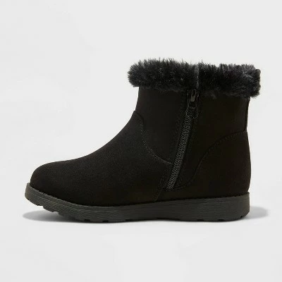 Finish off all her cold weather looks with the cute and comfy style of the Mila Zipper Slip-On Winter Shearling Style Boots from Cat & Jack™. Featuring a cozy shearling lining and ankle cuff, these faux fur lined boots are sure to keep her toes toasty and warm while complementing a variety of outfits, from tees and leggings to dresses and tights. Side zippers make for easy slipping on and off, while the 5-inch boot shaft height covers ankles for cozy wear with a variety of outfits.