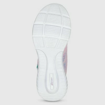 Stay dry in sporty comfort and fun colorful style wearing S Sport by Skechers Gillian. This lightweight slip-on sneaker features a water-repellent multicolor print mesh fabric upper with synthetic overlays in a stretch-laced sporty casual sneaker design with a cushioned Memory Foam comfort insole, glitter trim instep strap and shock-absorbing midsole.