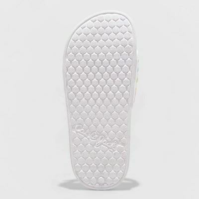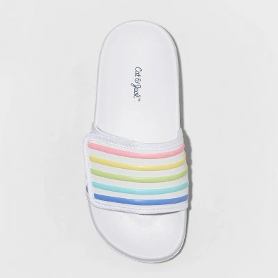Bring a fun update to their sunny weather wardrobe with these Shane Rainbow Print Slip-On Footbed Sandals from Cat & Jack™. Designed with a contoured footbed, these medium-width sandals offer their feet comfort, while the open toe and foot design makes them just the right pick for the warmer months. Featuring a slip-on design for easy on and off, these slide footbed sandals feature rainbow stripes on the upper band to add a colorful update to their sunny ensembles.