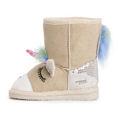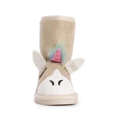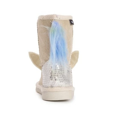 This magical pair of MUK LUKS Kids’ Animal Boots are sure to bring big smiles to little faces. This kid-friendly pull-on style boot features cozy faux fur lining, majestic unicorn details and reversible sequin texture for multi-colored fun. Wipe with a damp cloth to clean, no bleach, lay flat to dry. Imported.⢠Indoor/Outdoor Sole⢠100% Polyester Faux Fur Insole⢠100% Polyester, 100% Acrylic Upper⢠100% Polyester Faux Fur Lining ⢠Flat Heel⢠Kidsā Whole Sizes 8-12