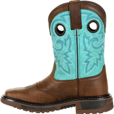 This Rocky Kids Original Ride FLX eight-inch Teal and saddle brown wellington is a great starter western boot for kids that like to get outdoors. Convenient pull straps and resilient material allows any kid to pull their boots on and go. Constructed with a light and flexible construction and padded cushioned insoles, these boots will be so comfortable, your child will never want to take them off! If you’re looking for a reliable boot that lets your kid go out in comfort and style.