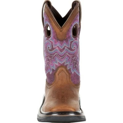 This Rocky Kids Original Ride FLX eight-inch purple and brown wellington is a great starter western boot for kids that like to go outside and play. Convenient pull straps and resilient material allows any kid to pull their boots on and go. Constructed with a light and flexible construction and padded cushioned insoles, these boots will be so comfortable, your child will never want to take them off! If you’re looking for a durable boot that will allow your kid to play in comfort all day long, this boot is exactly what you need!