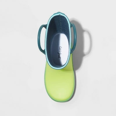 Make jumping and splashing in the puddles nothing but fun with these Ali Pull-On Rain Boots from Cat & Jack™. These rain boots for toddlers are designed with 100% rubber uppers to keep water out and their feet dry. Designed with a flocked outsole and featuring a closed-toe design to protect their toes, these medium-width rain boots feature a fabric insole to offer them comfy wear. Showcasing a colorblock design in three bright hues, they’re sure to add colorful style to their rainy day outings. Plus, two pull-on loops at the top make dressing a breeze.