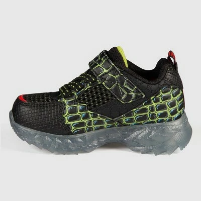 Stand out in roaringly cool style and athletic comfort wearing the S Sport by Skechers Drego shoe. This slip-on sneaker features a synthetic and mesh upper with a reptilian themed design, contrast colors and stretch-laced front in a sporty casual design with shock-absorbing midsole, flexible translucent rubber outsole and sculpted light-up details.