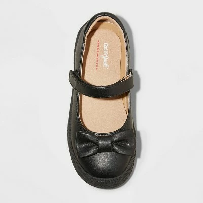The Ola Jelly Shoes from Cat & Jack™ make a comfy addition to your little girl’s wardrobe. These black closed-toe shoes are crafted from a soft and supple faux-leather upper with classic grained look, and they’re set on a no-heel, comfy rubber-like sole for added comfort. The slip-on design allows for easy on and off, while the instep strap with hook-and-loop closure helps to keep her foot in place with an adjustable, secure fit. A lovely bow-tie 3D design on the top adds a delightful touch of detail. These versatile ballet flats for toddler girls pair effortlessly with a variety of outfits from dresses to jeans, plus they’re easy to incorporate into school or formal looks.