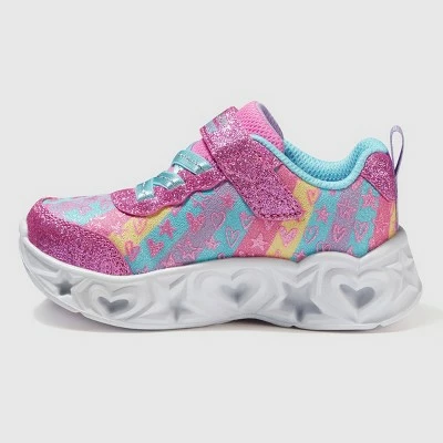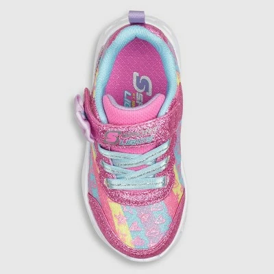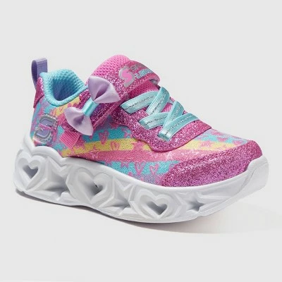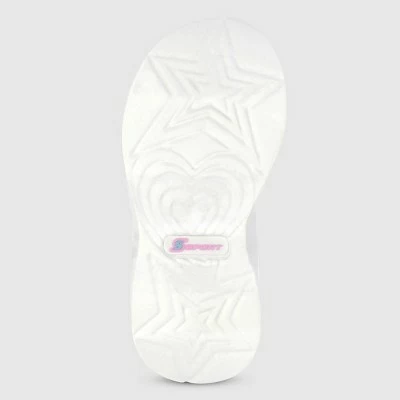 Light up your day with a pretty bow on top while wearing the S Sport by Skechers Mae shoe. This slip-on sneaker features a glitter synthetic and multicolor fabric upper with a heart and star print in a stretch-laced sporty casual sneaker design with a light-up shock-absorbing star shaped sculpted midsole.