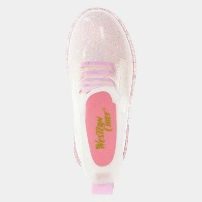 Our best selling glitter combat boot, with a fun flower power twist! Our shimmer glitter is accented with coordinated pastel pink faux laces to make it easy for our youngsters to pull-on. Also, matching pick glitter soles, back pull tag make for fun detailing. Infused with our highest concentration of our sparkiliest glitter. Patterned significant soles for extra grip for safety.