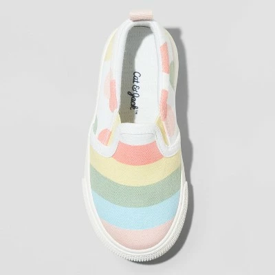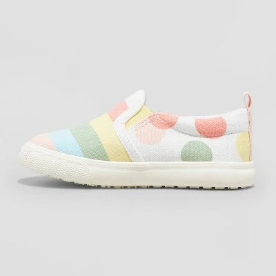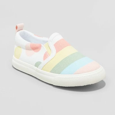 Update your tiny tot’s footwear collection with these Zuri Rainbow Dots Print Slip-On Apparel Sneakers from Cat & Jack™. Designed with a flocked outsole, these closed-toe sneakers feature a cotton upper to keep her walking in comfort throughout the day, along with elastic goring on the sides that make them easier to put on and take off. These slip-on sneakers feature a rainbow and dots print for added interest, making them a perfect addition to her casualwear outfits — whether taking a stroll with you around the neighborhood or getting ready for a playdate.